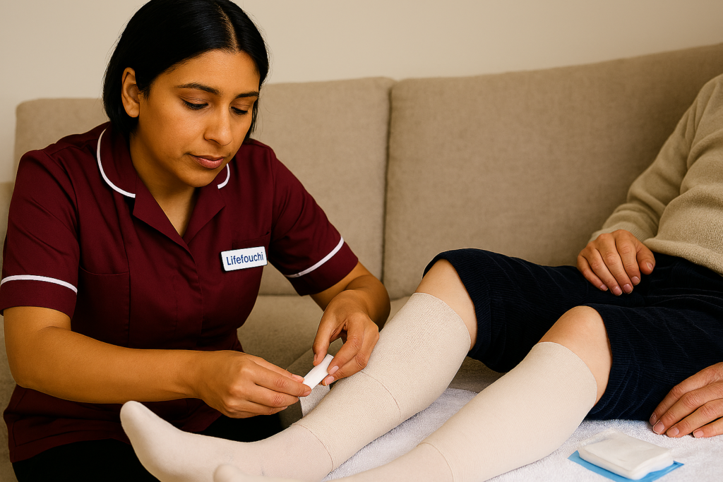Lifetouch Care supports people with long‑term leg ulcers by providing structured, consistent dressing care at home. Venous, arterial, and mixed‑aetiology ulcers require accurate diagnosis and tailored treatment. Venous ulcers often benefit from compression therapy when clinically appropriate, while arterial ulcers require careful vascular assessment before compression is considered. Dressing plans focus on managing exudate, protecting peri‑wound skin, and supporting granulation tissue.